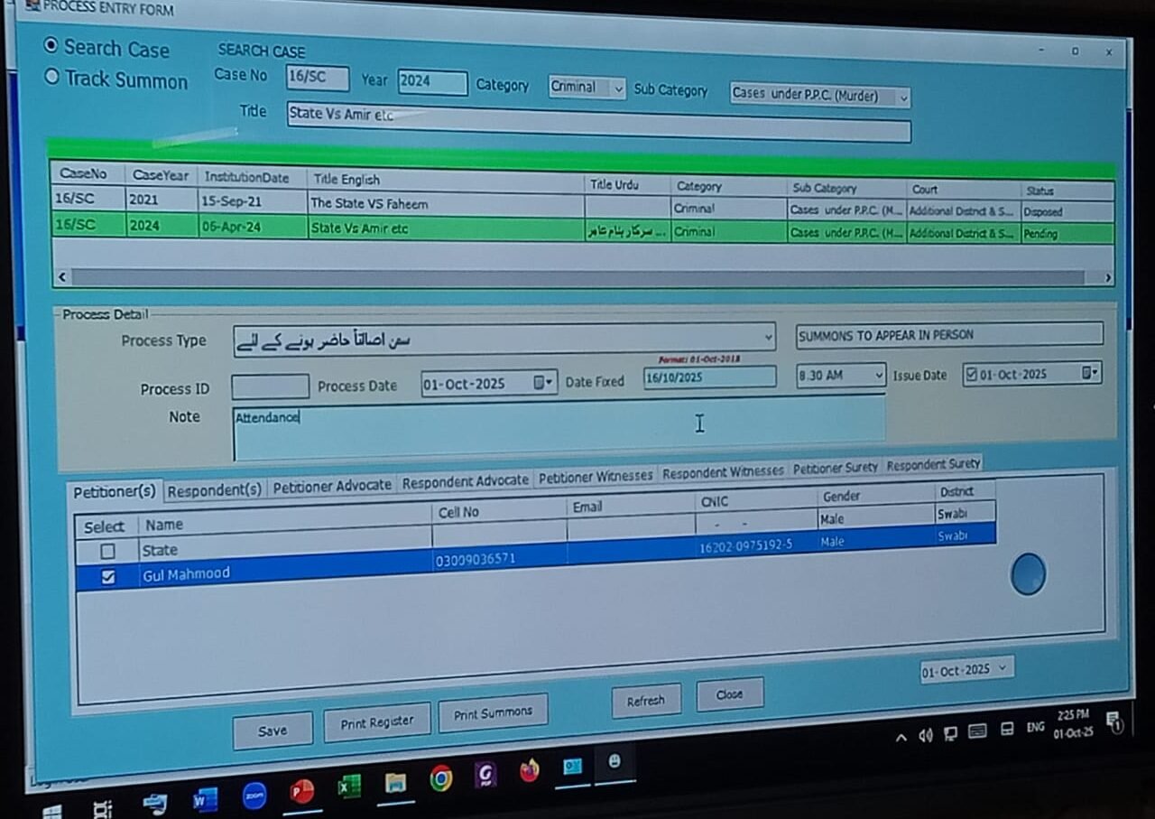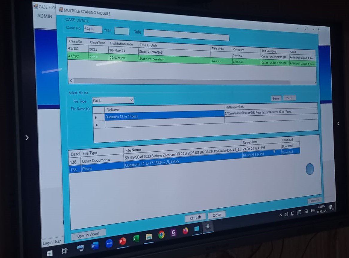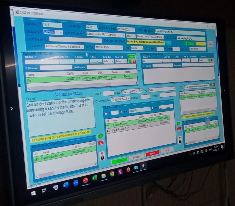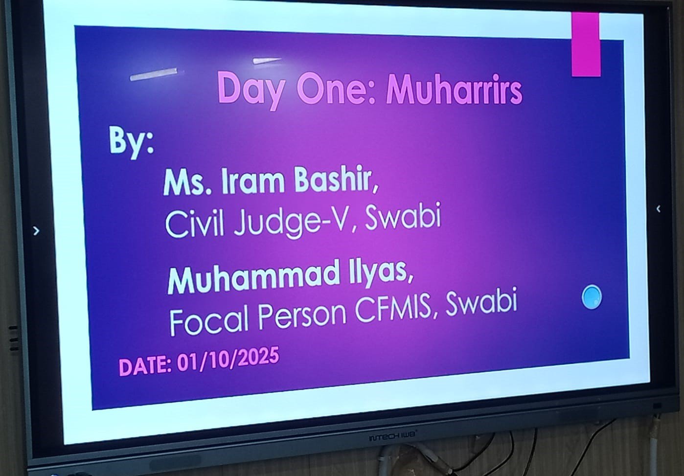 On October 1, 2025, under the directions of Honourable, The District & Sessions Judge, Swabi a training session was held in the Conference Room of the Sessions Court, Judicial Complex Shahmansoor, Swabi, for Moharrirs of courts. The session was conducted by Ms. Iram Bashir (Civil Judge-V, Swabi) and Muhammad Ilyas (Computer Operator / Focal Person CFMIS), who provided both theoretical guidance and hands-on demonstrations to ensure participants gained practical skills in using the Case Flow Management Information System (CFMIS).
